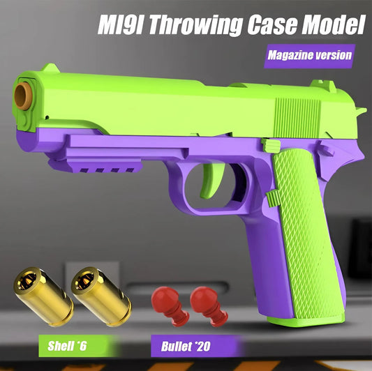 Discover the ultimate toy gun set! The small anti-stress blaster is perfect for fun on the go, offering automatic recoil for a satisfying feel. The larger blaster takes it up a notch, shooting bullets with shells that eject from the top with every shot, adding a realistic touch to your play!